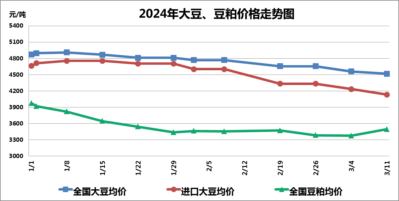 本周受进口大豆价格下跌的影响,全国大豆平均价格稳中有降。截至3月11日,全国大豆平均价格为4518元/吨,较上周下降0.92%。