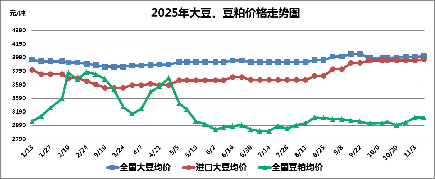 本周全国大豆平均价格基本平稳,截至11月10日,全国大豆平均价格为4012元/吨,较上周上涨0.38%。