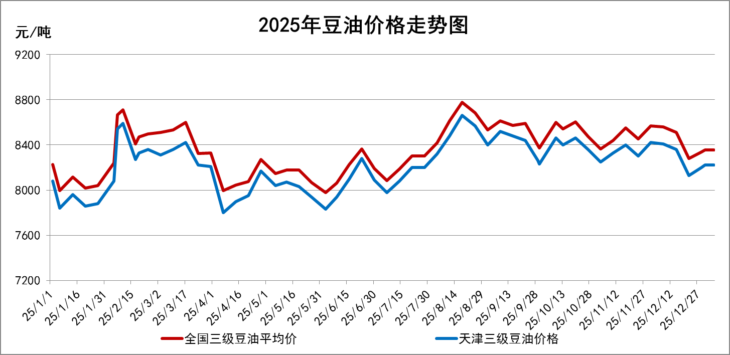 2025年我国豆油市场供应整体充裕,但受多重外部因素扰动,全年价格较年初微幅上涨,走势呈现“冲高—回落—攀升—下行”的阶段性波动特征,价格重心受成本支撑上涨,波动则围绕供需格局变化、国际油脂期货价格与国际贸易政策影响展开。
