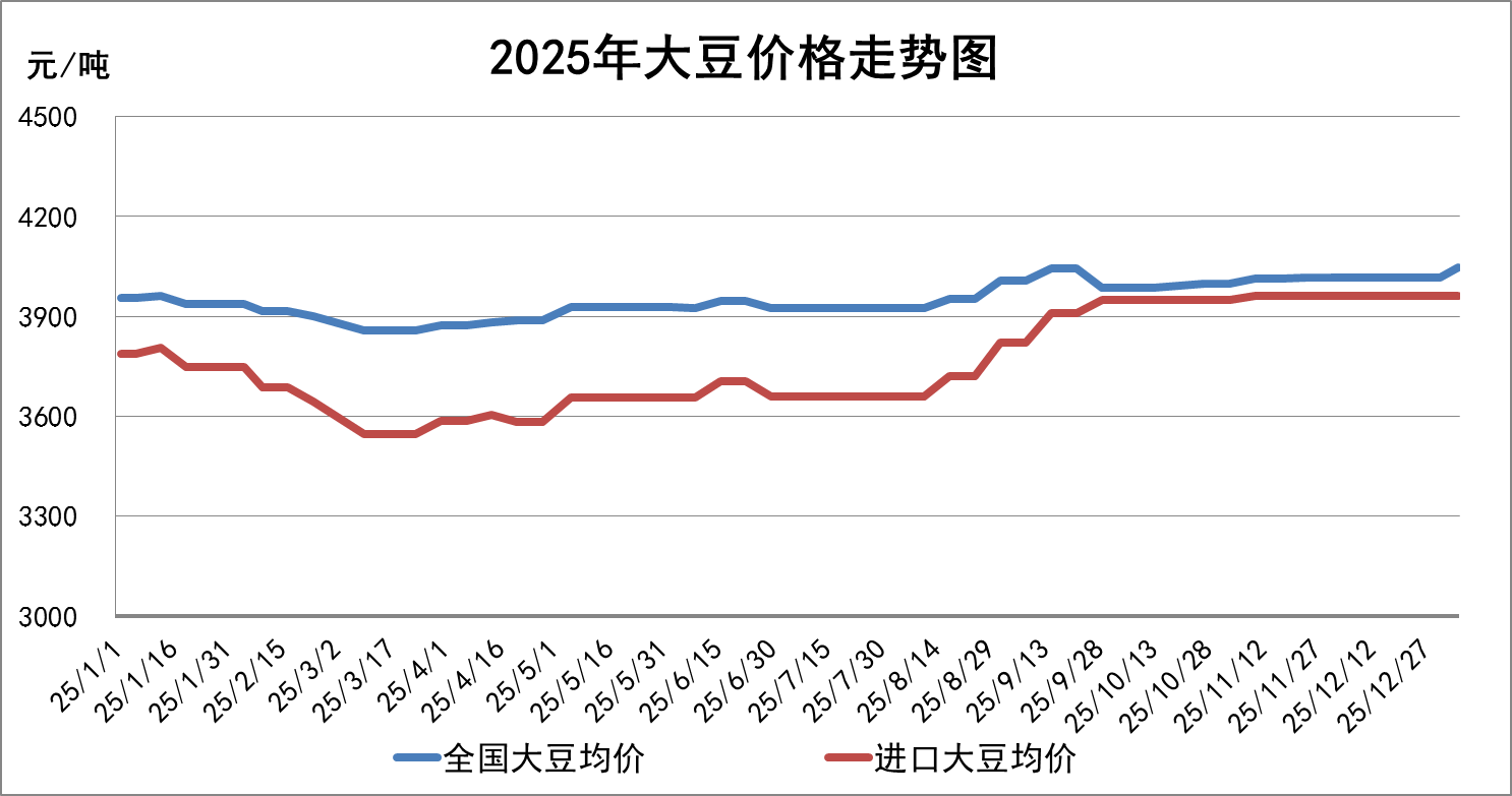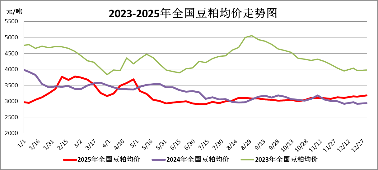 2025年全年豆油、大豆价格重心上移,价格较年初微幅上涨,豆粕价格受进口成本支撑,价格较年初明显上涨。