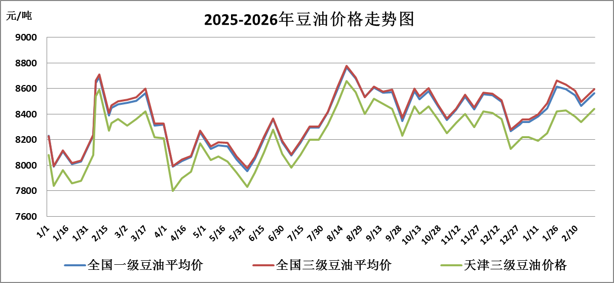 本周全国豆油供应充裕,价格微幅上涨,主要原因一是受国际油脂期货价格上涨及美国生物柴油政策落地预期等影响,春节期间外盘油脂价格走强,节后国内价格跟随上涨;二是节后下游补库需求支撑豆油价格,但市场对豆油价格较敏感,豆油价格涨幅有限。