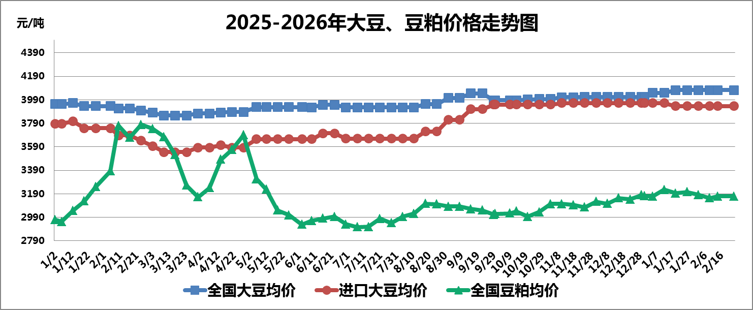 本周芝加哥期货交易所(CBOT)大豆期指价格稳中有涨,一是南美天气炒作推高豆价,二是美国国内压榨需求良好,对美豆期价形成支撑,截至2月24日收盘,美豆期指报收1150美分/蒲式耳,较上周上涨0.59%;大连商品交易所豆二期指基本平稳,主要受美豆期价影响,但由于春节假日,传导效应减弱,截至2月24日收盘,豆二期指报收3542元/吨,较上周上涨0.08%。